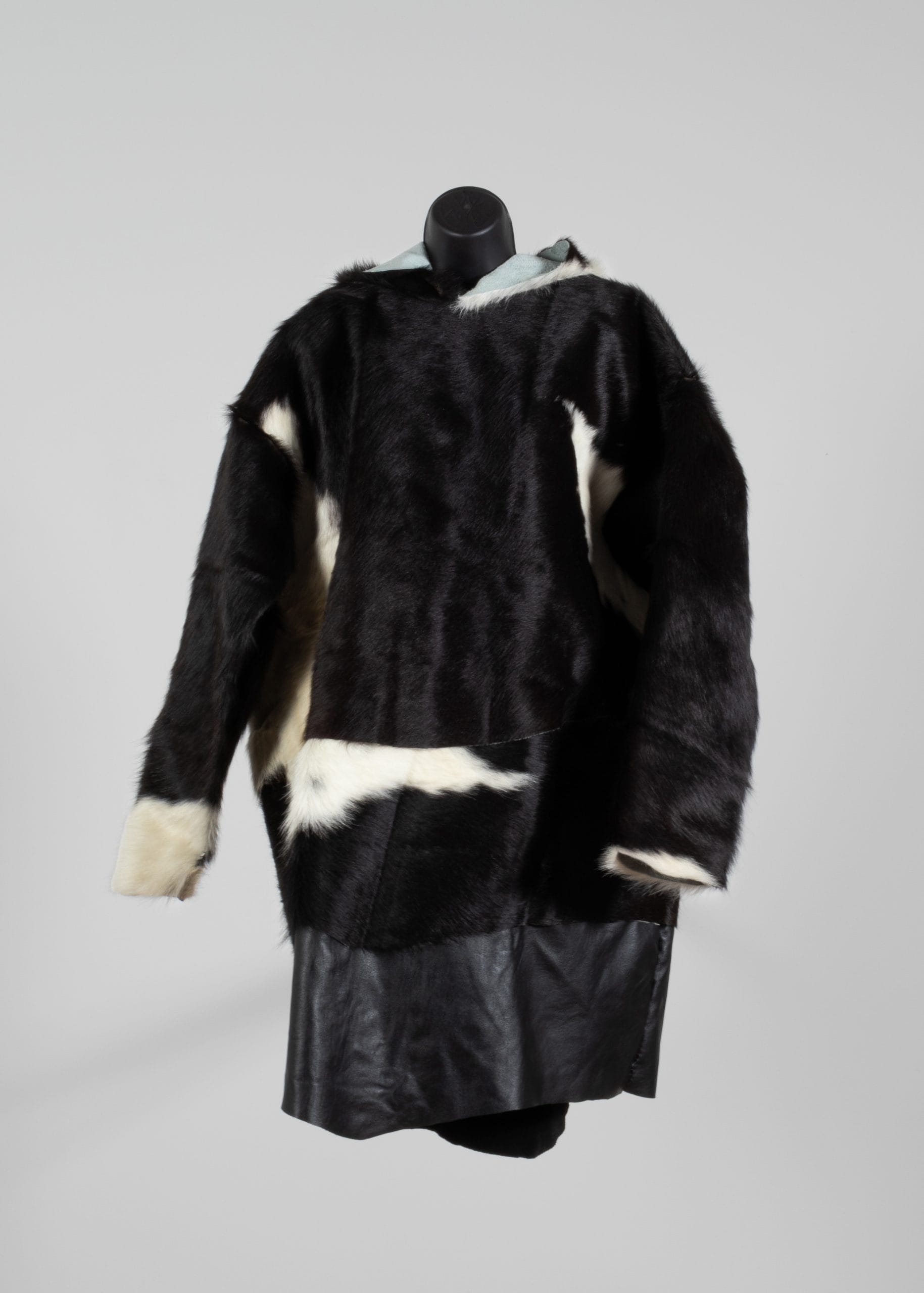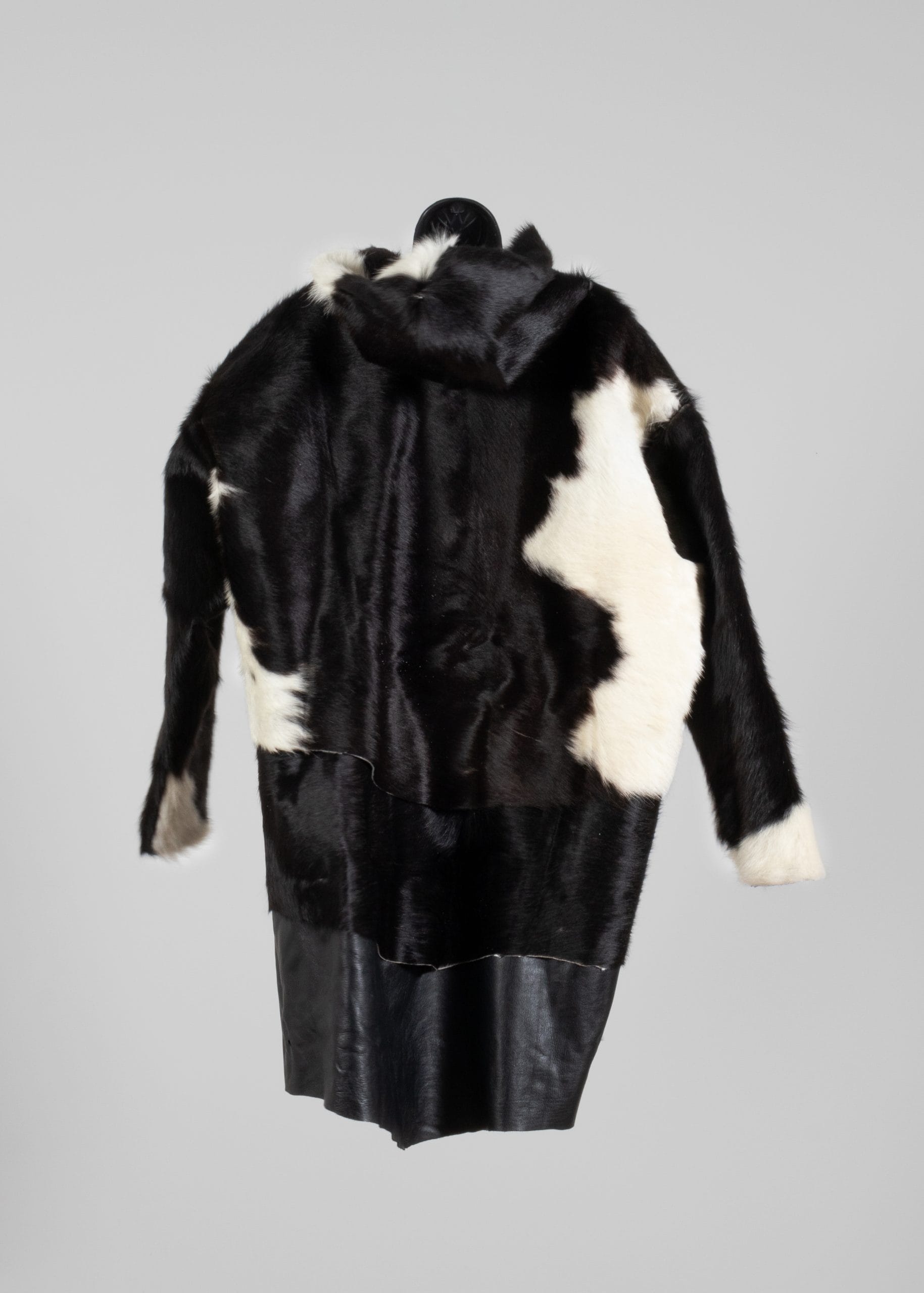 hair-on cowhide rug, black leather, artificial sinew