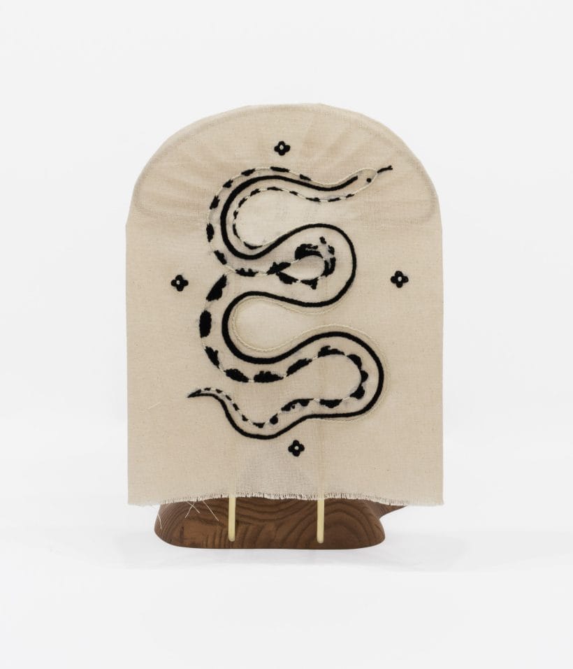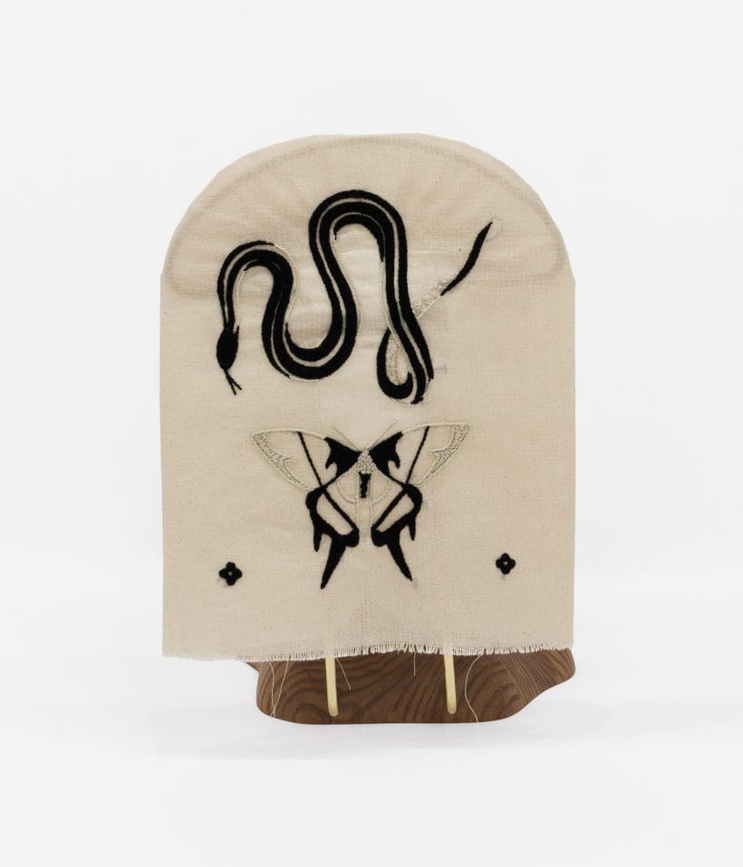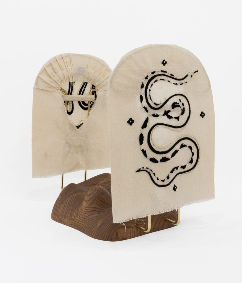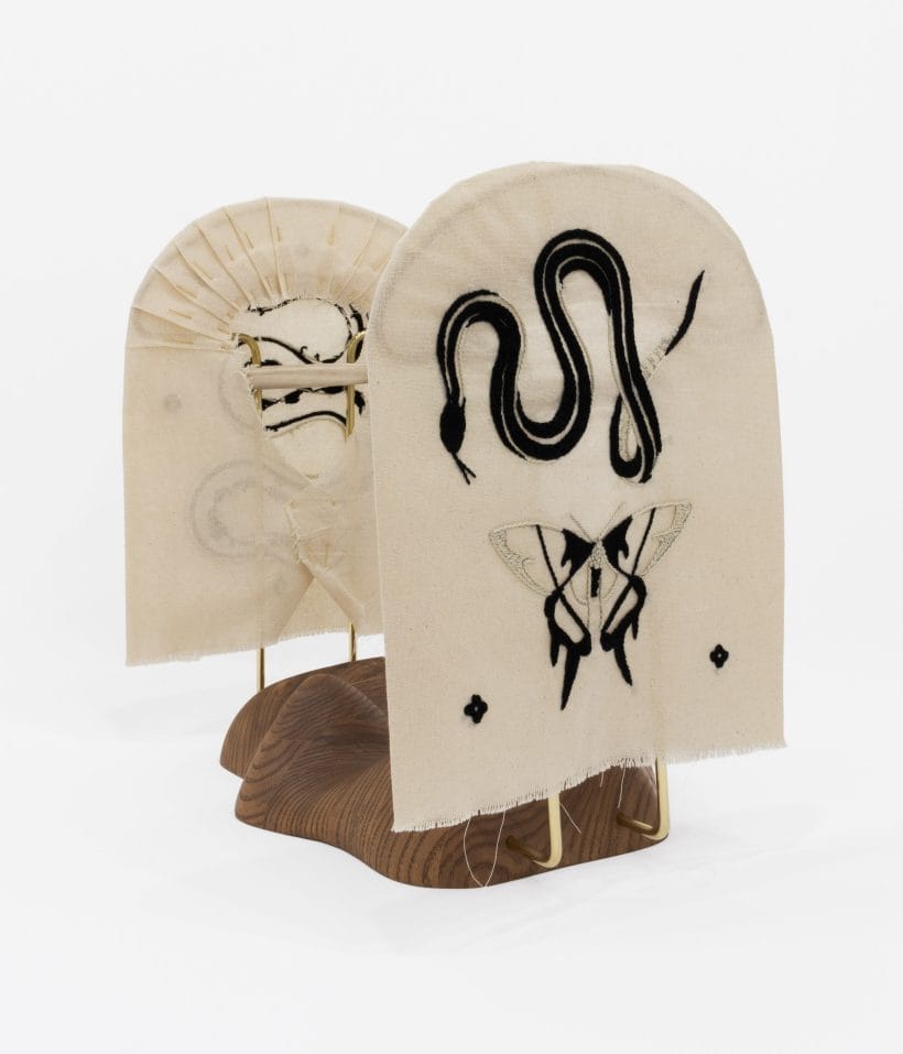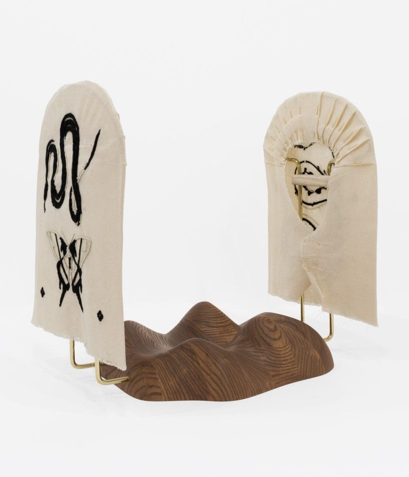 ash with wax finish, brass, cotton, embroidery thread, metal pins