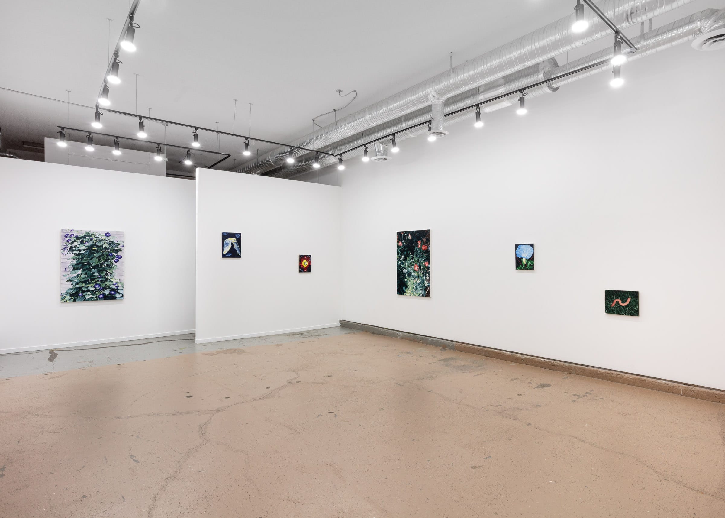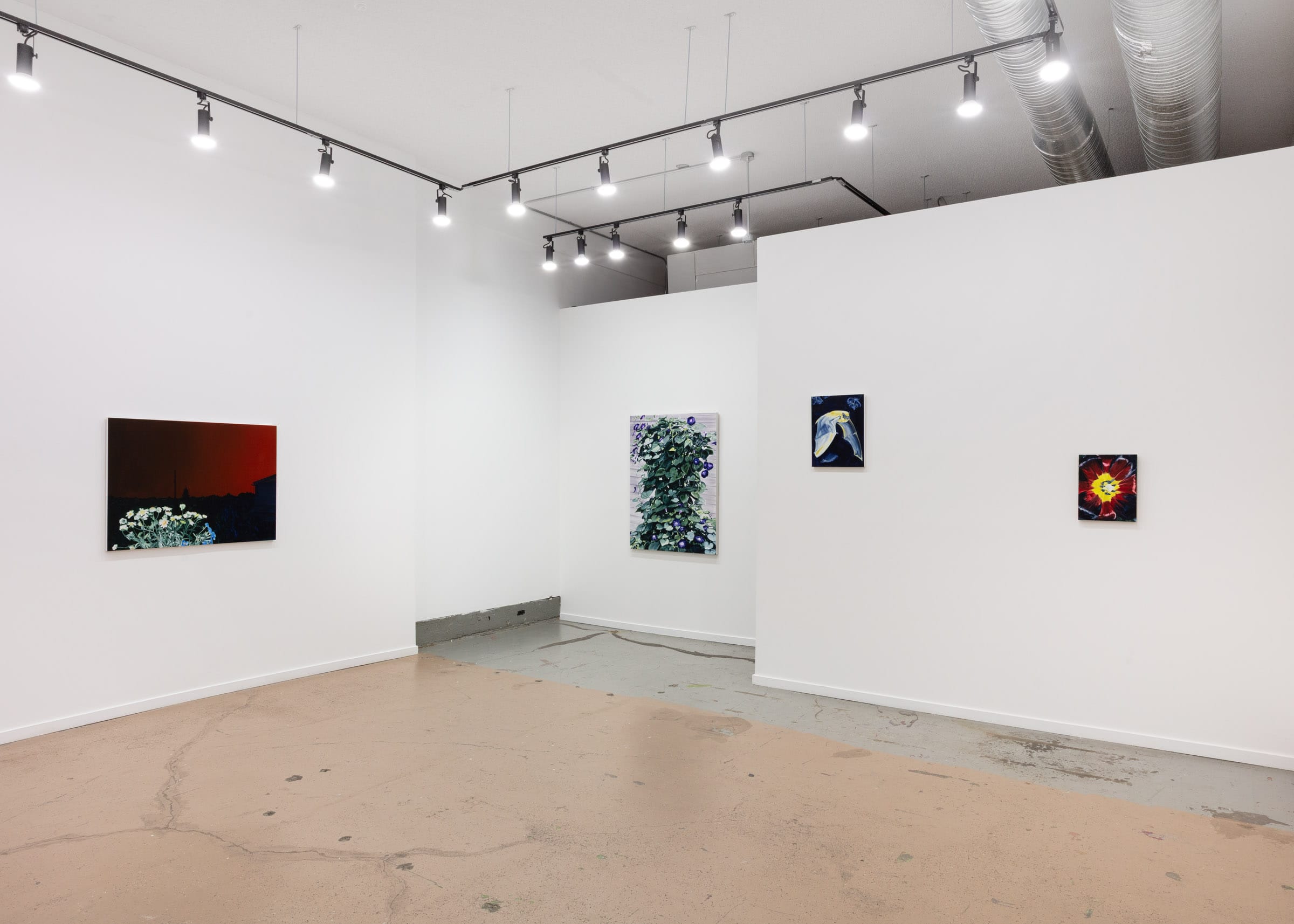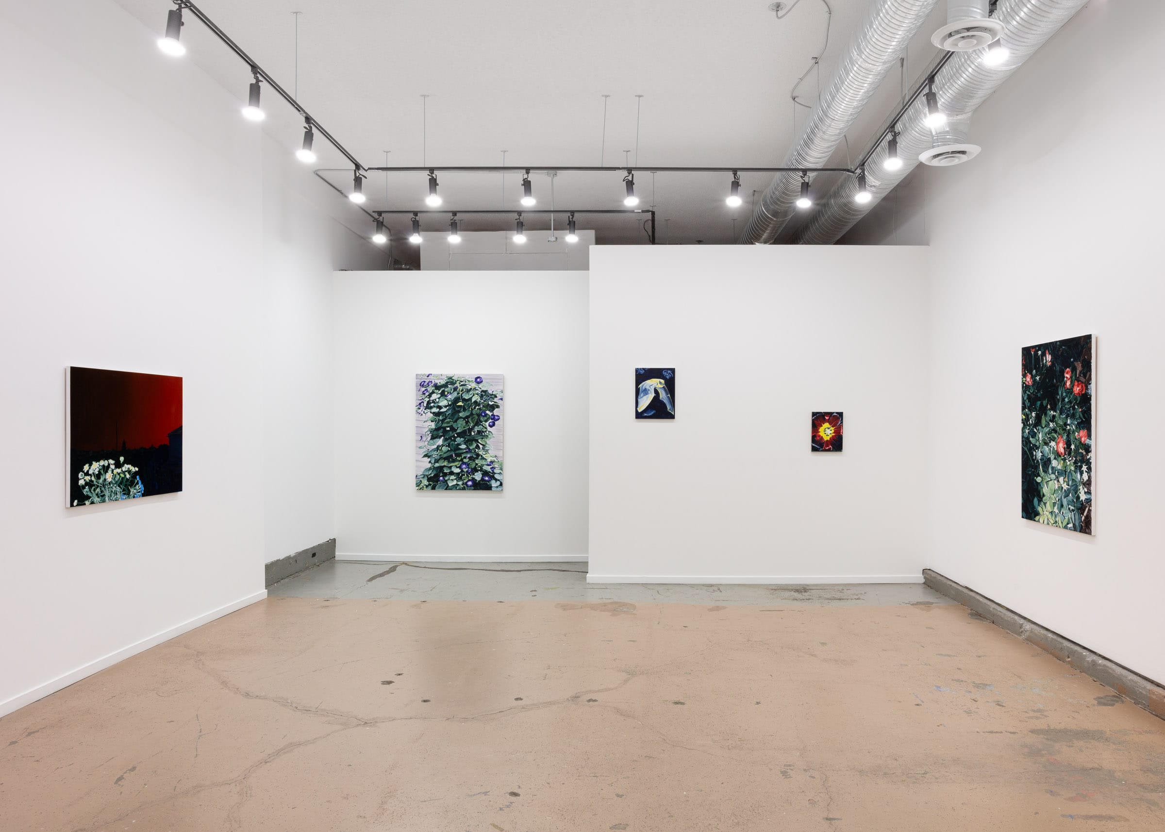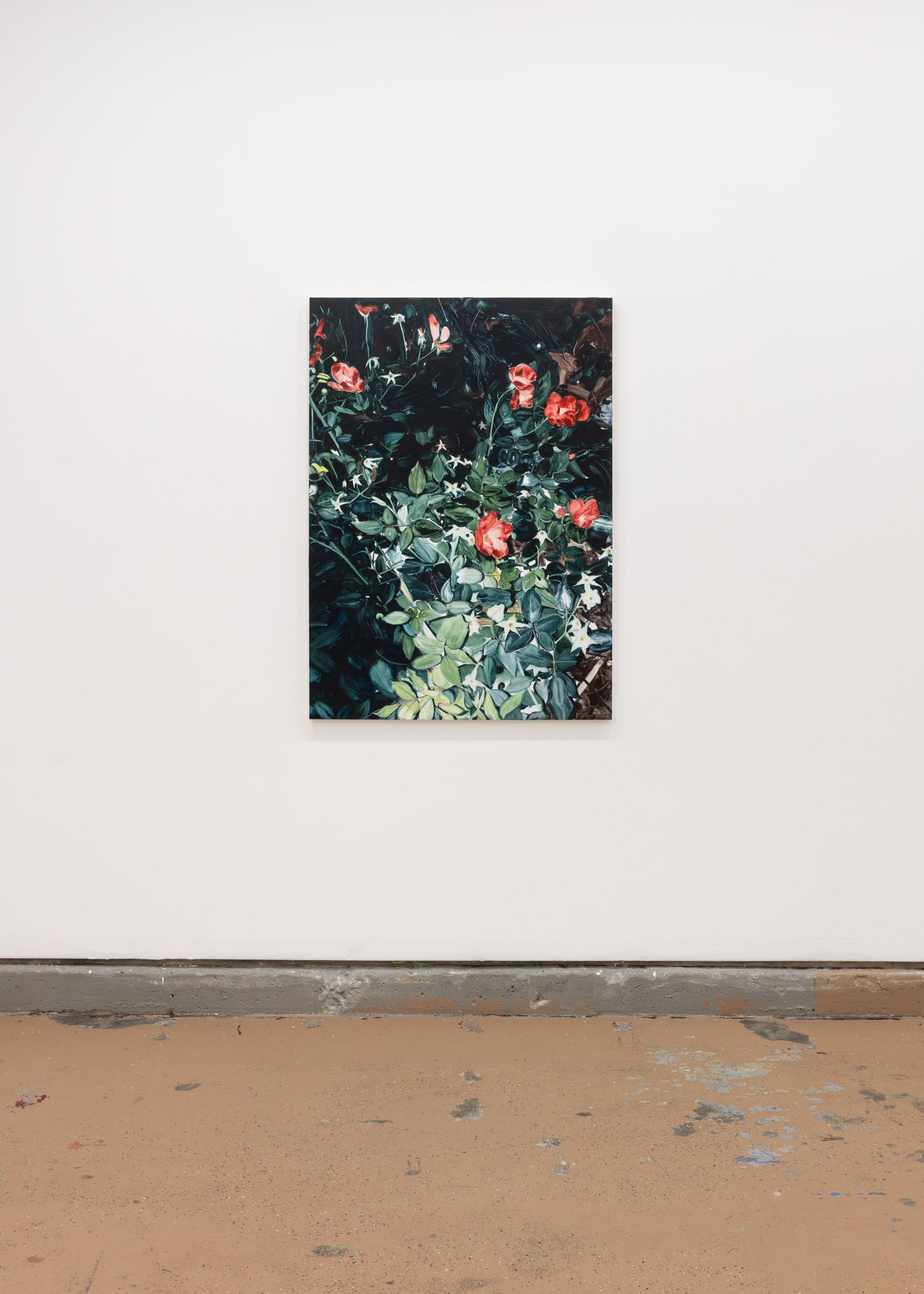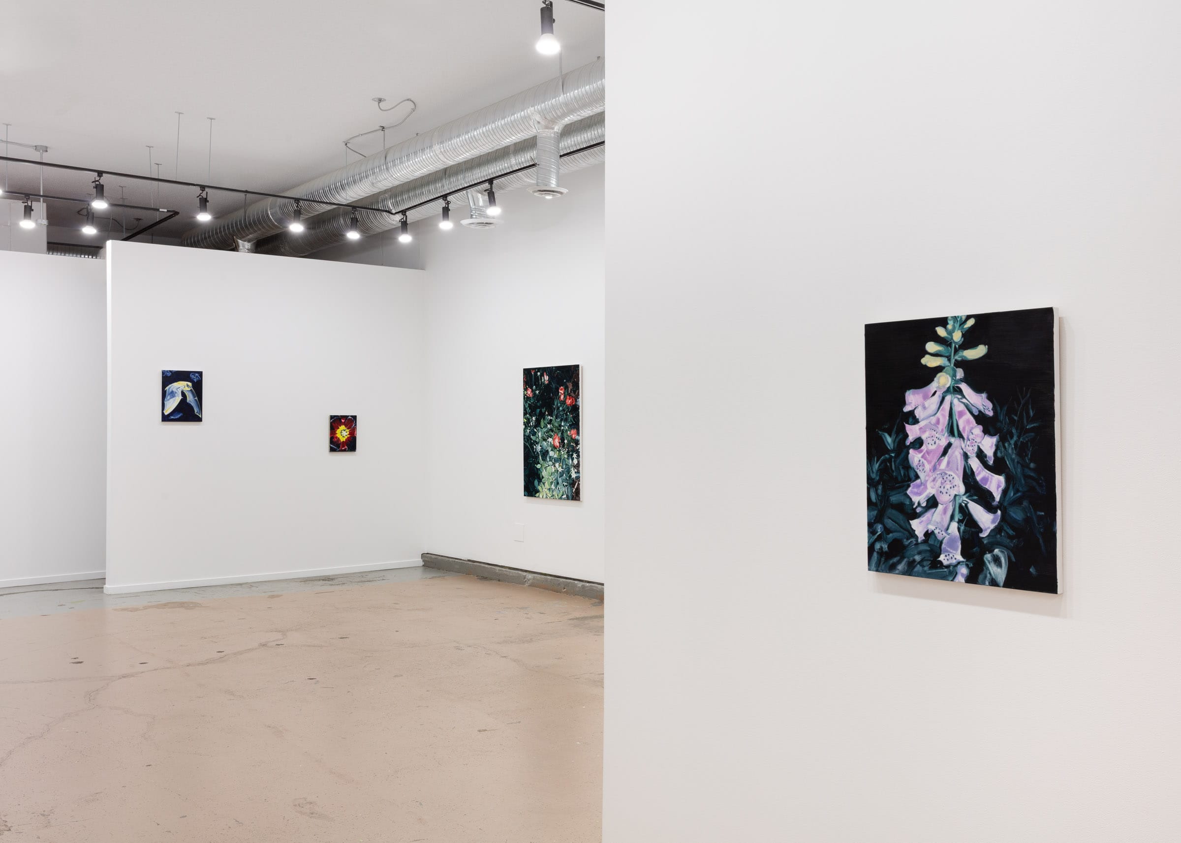 First, I see the photographic negative. I admit this, on my part, to be an error—the colours in these paintings are not reversed but flooded by the flash—yet the ethereal glow of the night garden recalls a darkroom alchemy. Laura Findlay is also a professional photographer who began honing her skills as a teenager with a series of jobs in photo labs; this entrenched sensibility shows up in her play of light and dark as well as in the images themselves, which are scavenged, manipulated, and reborn on the studio floor.
