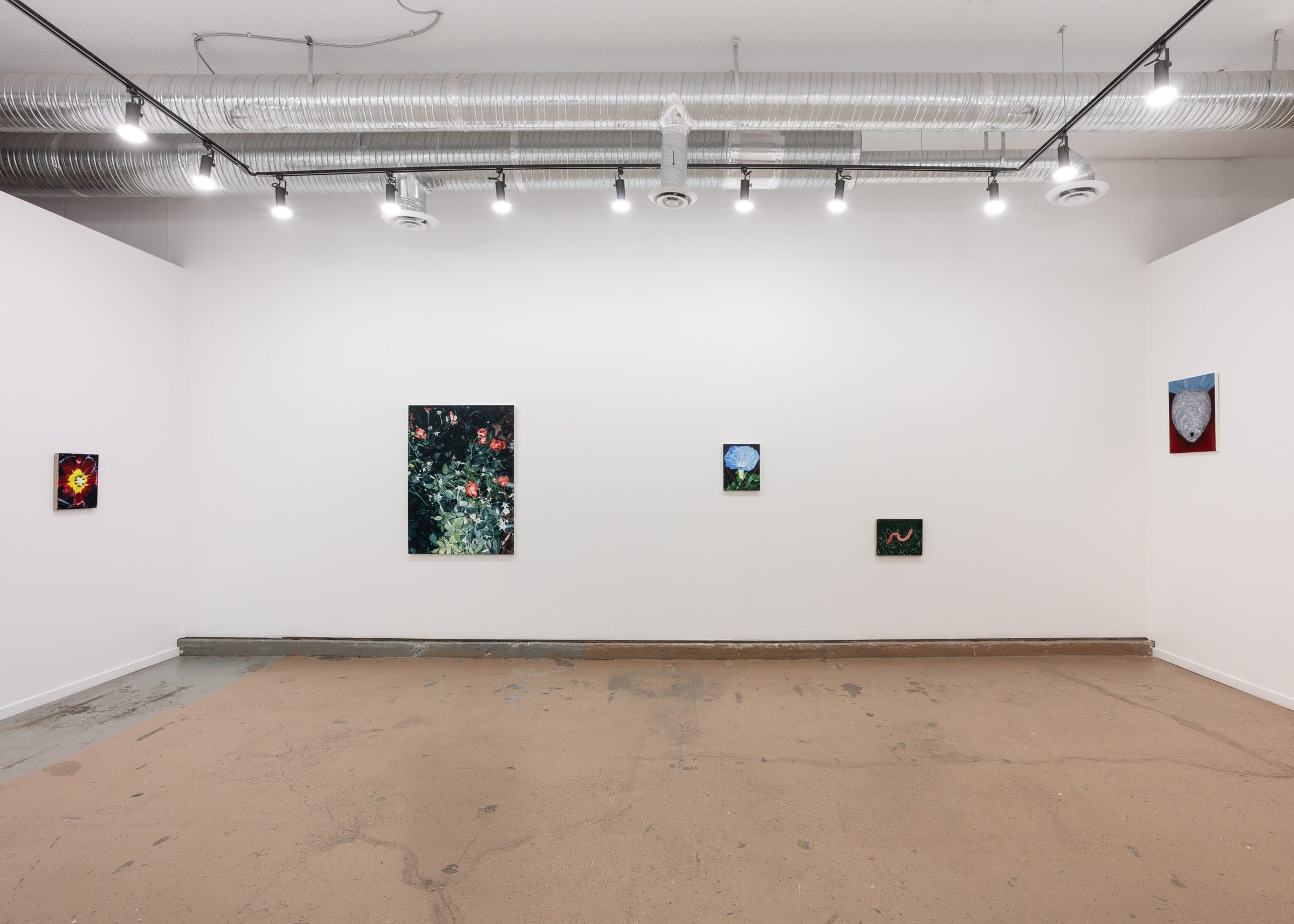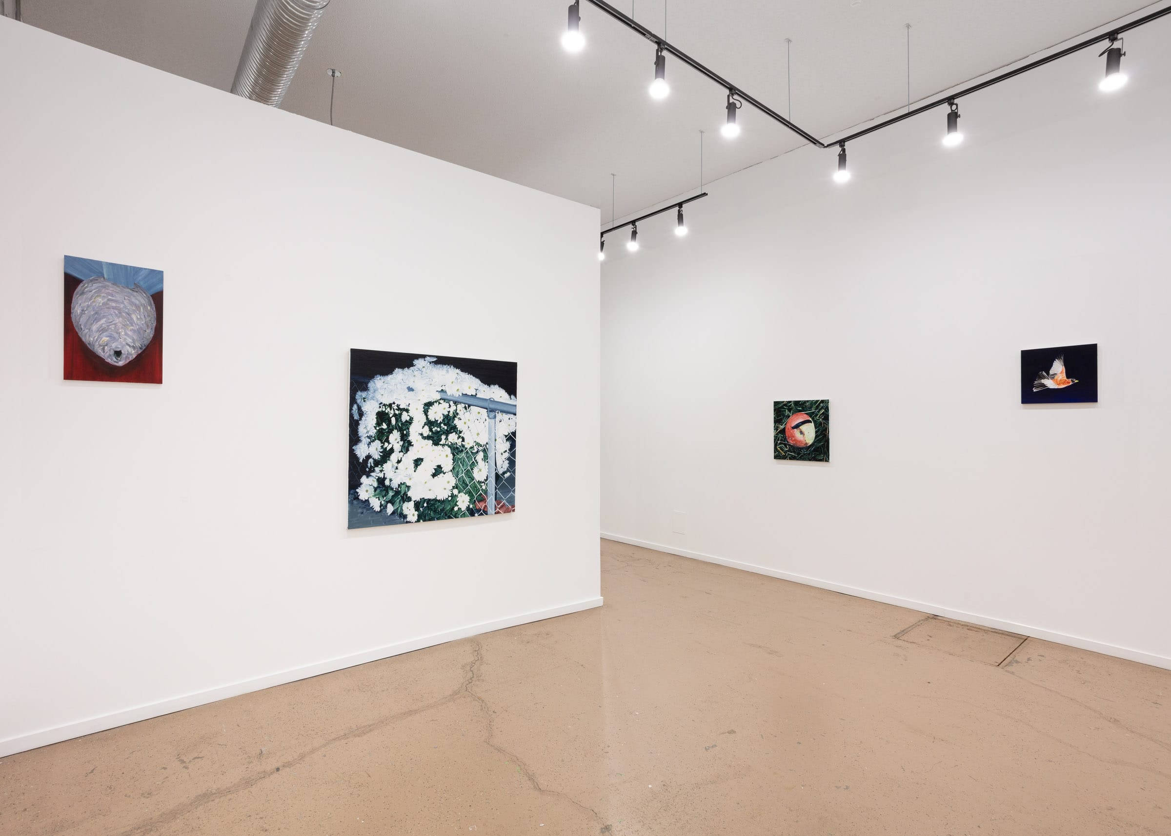 I see too, in Findlay’s paintings, a tenderness. Fecund but fleeting subjects appear in a palette that hints of a rising sun. The promise of a bursting blossom; a fat worm on cut wet grass; red fruit ravaged by hungry bugs; wing, plume, and incandescent rot. I feel here the ephemerality that both painters and poets have long ached to capture, that other negative—the “negative capability”—which Keats experiences attempting to cage a nightingale with rhyme and metre. The felt truth of his project has outlived its poetic cliché: meaning found only in beauty, and beauty only in transient uncertainty.[i] The life cycle may be long, but oil paintings will also have their day in the mud; perhaps this is itself a wonderful reason, these pieces suggest, for us to continue making them.