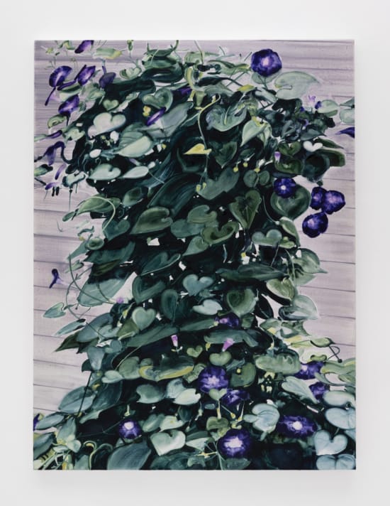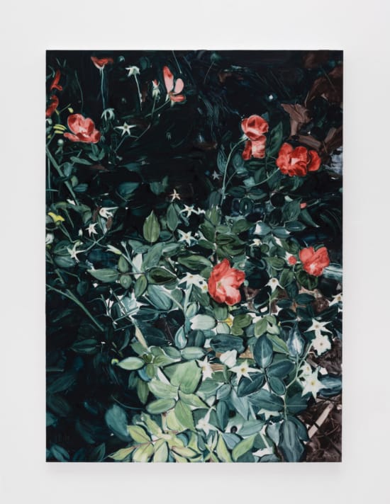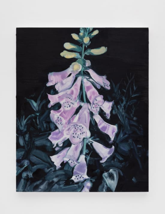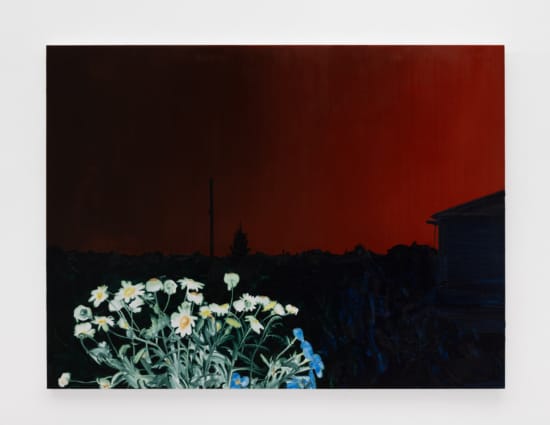First, I see the photographic negative. I admit this, on my part, to be an error—the colours in these paintings are not reversed but flooded by the flash—yet the ethereal glow of the night garden recalls a darkroom alchemy. Laura Findlay is also a professional photographer who began honing her skills as a teenager with a series of jobs in photo labs; this entrenched sensibility shows up in her play of light and dark as well as in the images themselves, which are scavenged, manipulated, and reborn on the studio floor.