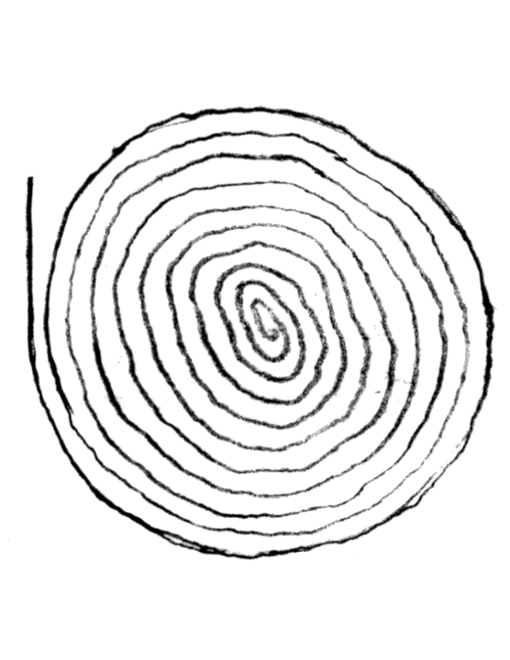 Trees grow in layers outward from their centre, each layer a season of growth. It’s popularly understood that a tree’s age can be determined by cutting it down and counting the growth rings.Other elements can be understood from the reading of the rings: if the tree grew on a slant or was forced to lean at some point; if it was struck by lightning; if a volcano erupted in its lifetime; if it was infected by a disease or fought against parasitic infestation, when, for how long, if it survived that, and what effect that struggle had on its life after.