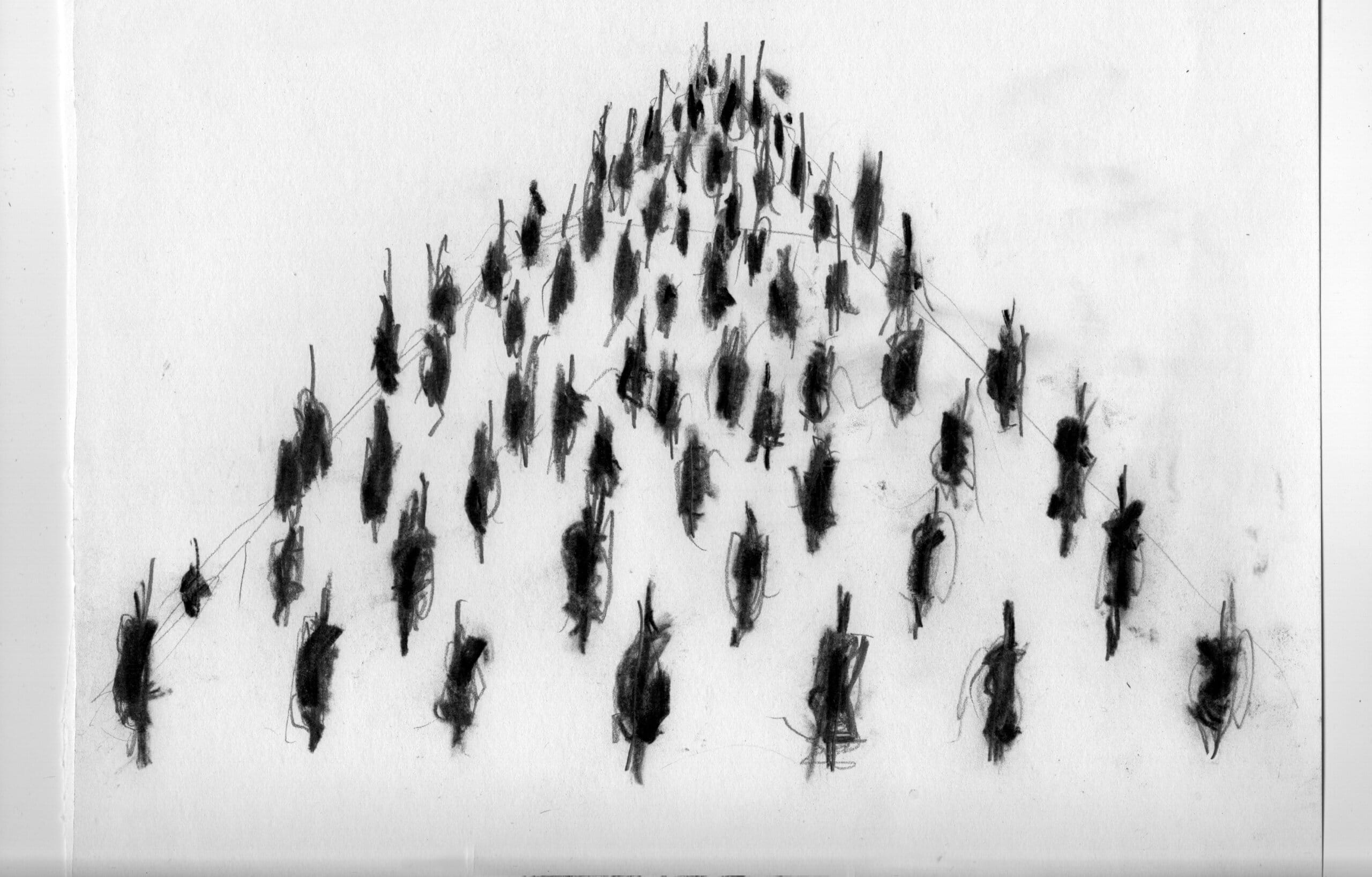 Initial, 18th century forays into reading the papyri were “ruinous”. Works were gutted from top to bottom, crushed by the atomic weight of mercury, cut into quarters or simply scraped away. To read a carbonized papyrus without destroying it would require a kind of seeing which could both penetrate the carbon layers of the spiral, and discern the charcoal-based ink from the charcoal of the page. This method, this eye, would read in spirals inward, from the widest diameter of the outer layer, toward the core of the umbilicus. The reading would take place inside of a purpose-built library chamber bathed in bright sunlight (as the carbon of the scrolls is UV-impervious) and a labyrinth of baffles to prevent even slight air currents which could flake valuable layers from the scrolls. As the text is arrayed latitudinally, for ease of comprehension the scrolls would be oriented vertically in the room, like a small forest of charcoal stumps.